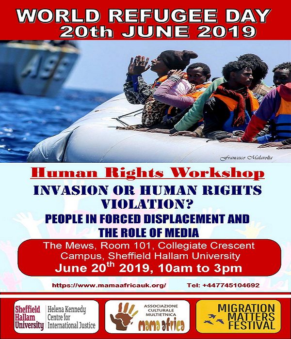 On June 20, 2019, Mama Africa UK & Italy, in partnership with Sheffield Hallam University, Migration Matters Festival, and the Helena Kennedy Centre for International Justice, hosted a thought-provoking workshop titled “Invasion or Human Rights Violation? People in Forced Displacement and the Role of Media.”